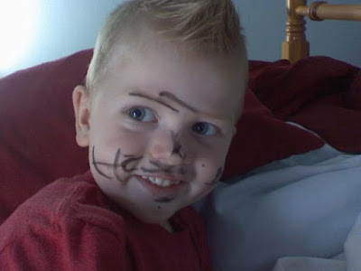 UPDATE: for clarification... Sam asked Glenda to color with a marker. He was coloring with this marker on our bed. The canvas that he chose to create his masterpiece: his face and our sheets. He looks so proud of his wonderful picture.